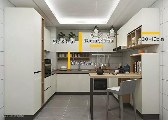 高度:高度也要小于地柜高度,一般在50-80cm之间,以免造成整体厨房头重脚轻的情况。