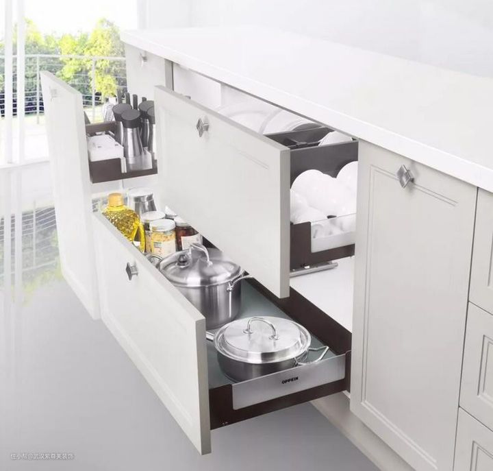 抽屉式地柜,只需伸手抽拉柜子就能取物,物品还可以按使用频率安排上下层位置收纳,不用总是弯腰或蹲下取出物品。