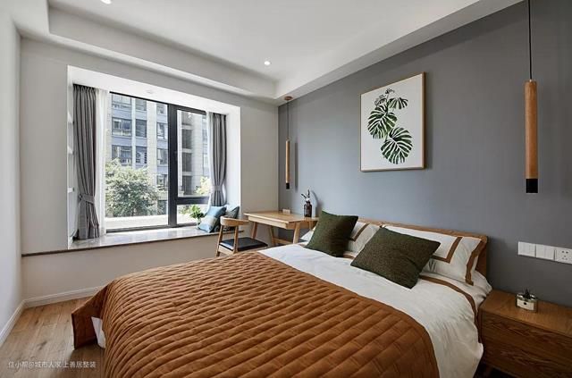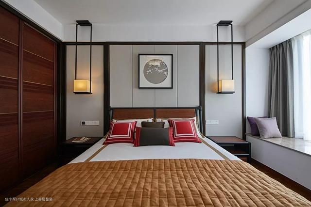 主卧同样采用对称设计,方圆镜像的装饰画,配上丝绸的纯柔质感,烟熏灰的朦胧之态,再挂上方形的荧荧宫灯,便令人为之暖意深陷。
