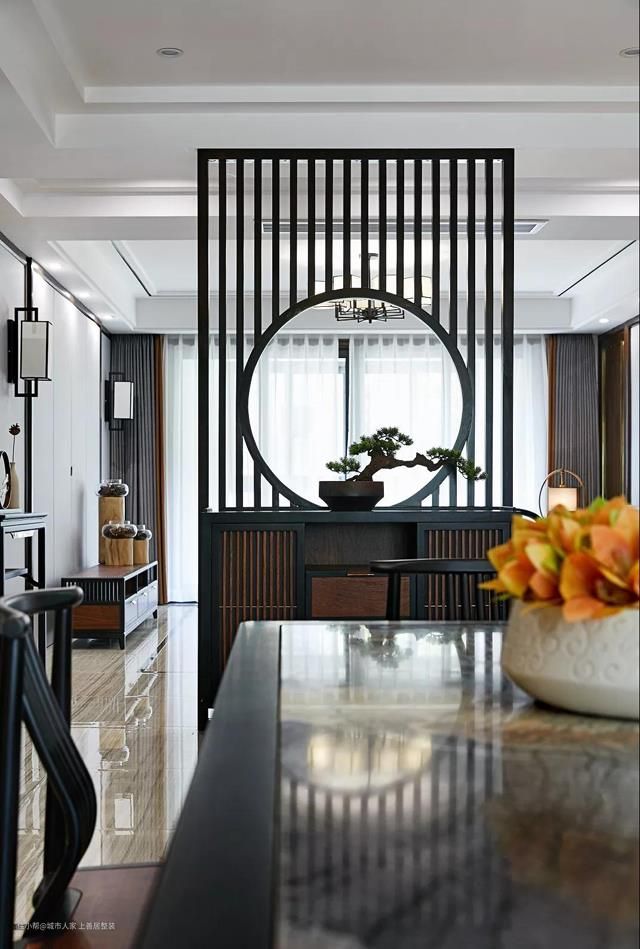 餐厅可见卧室门口另立花格,虚实之间,既给与居住之人隐私,又不破坏空间的通透性,尤其对玄关正对卫生间的家中可借鉴参考。