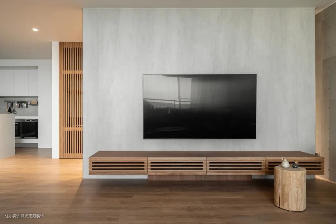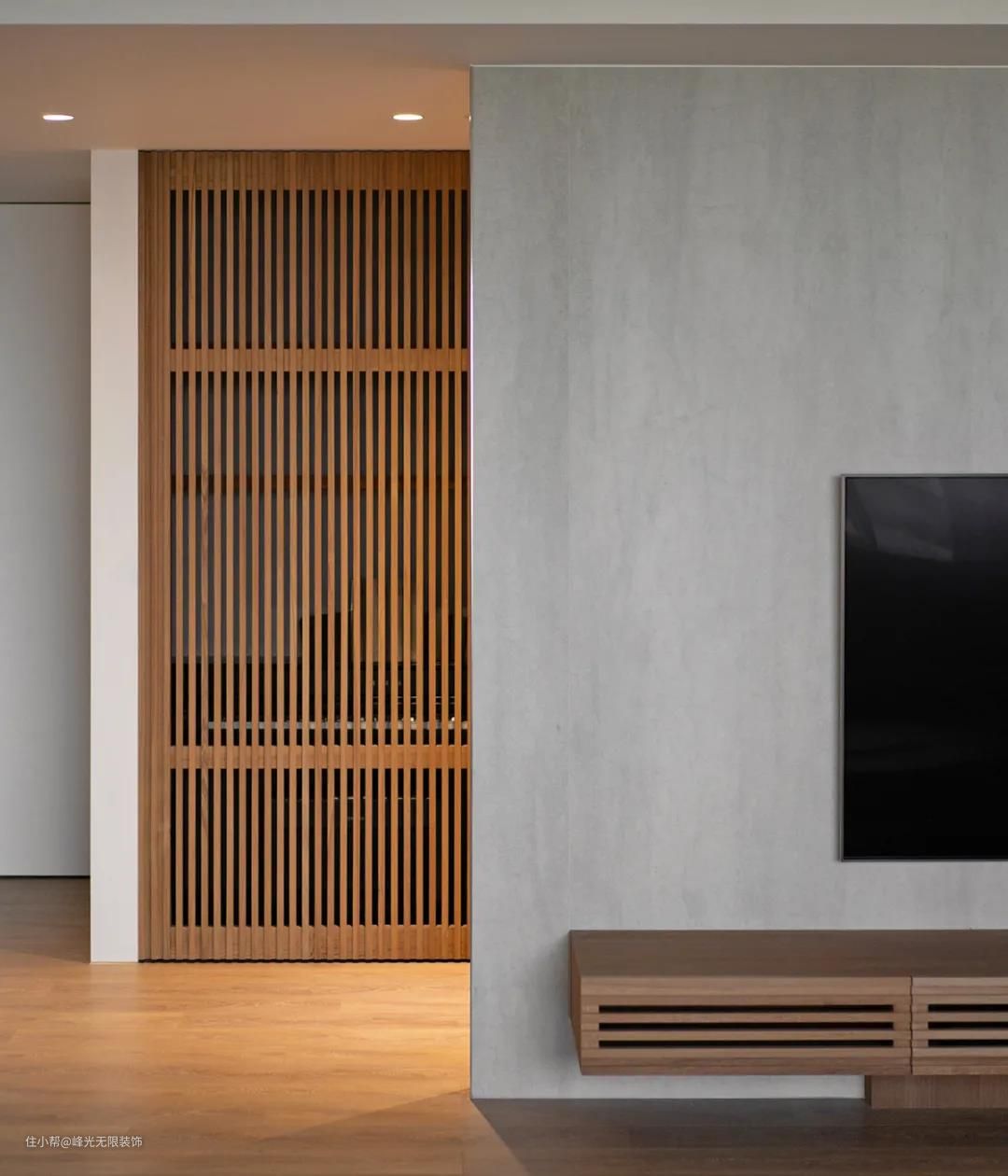 客厅电视背景墙底部搭配悬吊式影厅设备柜,格栅特性保留红外线遥控的灵敏感应。