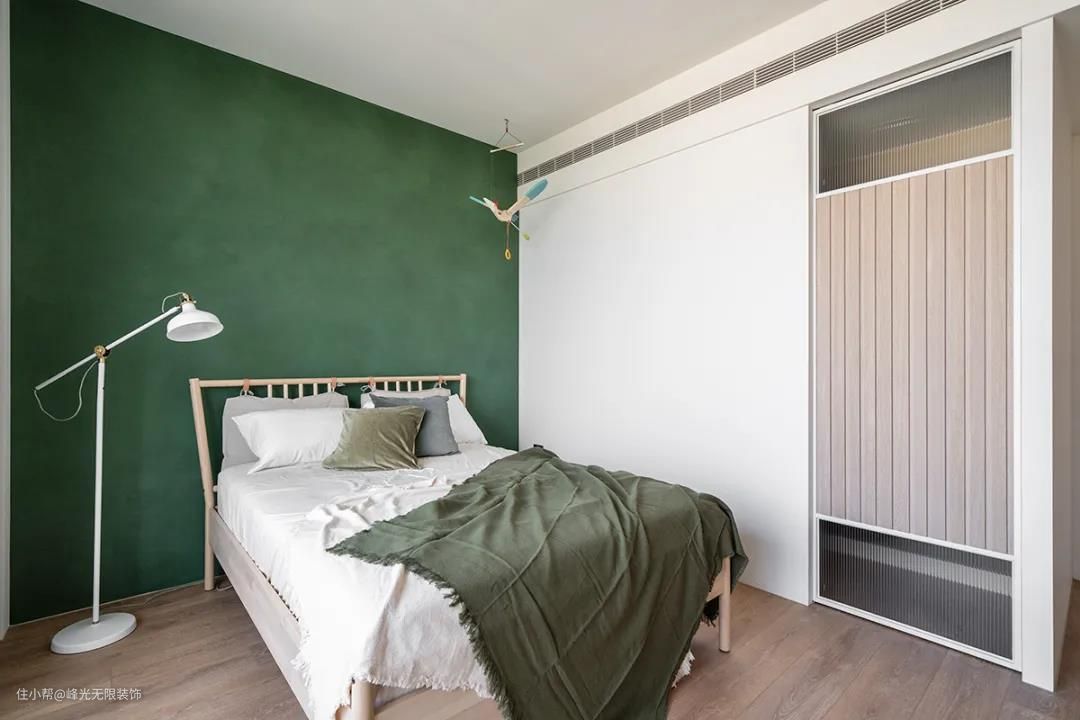 次卧背景墙涂刷苍绿色搭配浅棕色床架,清新质朴。