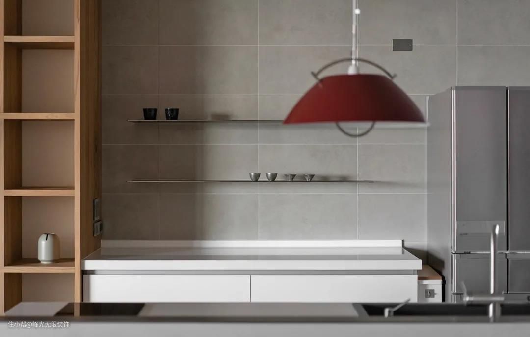 后方选用轻盈纤薄的嵌入式铁件,陈列展示屋主的茶具等。