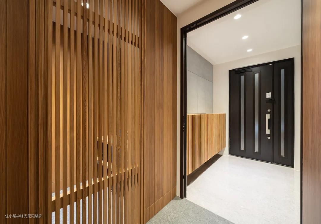 进门玄关空间顺延木格栅鞋柜,木格栅增加独立储藏空间,放置行李箱,并配置吊杆收纳常穿的衣服。