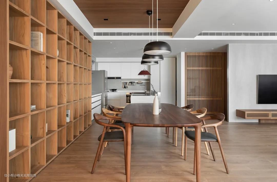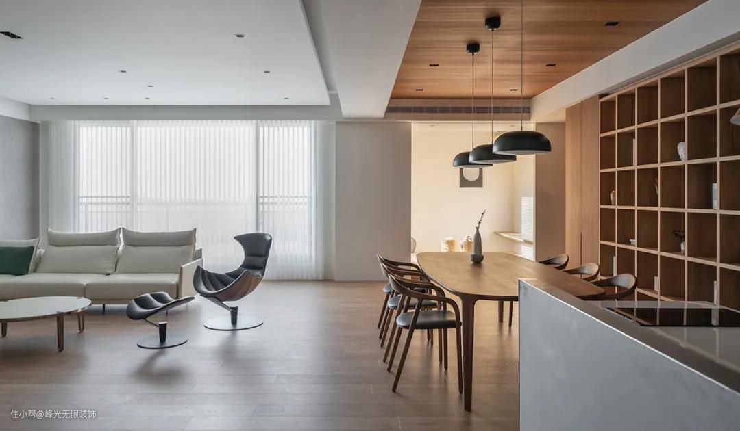 餐厅顺势从结构拓展非洲柚木实木皮,划分不同功能区,透过沉稳木色和餐桌椅达到呼应。