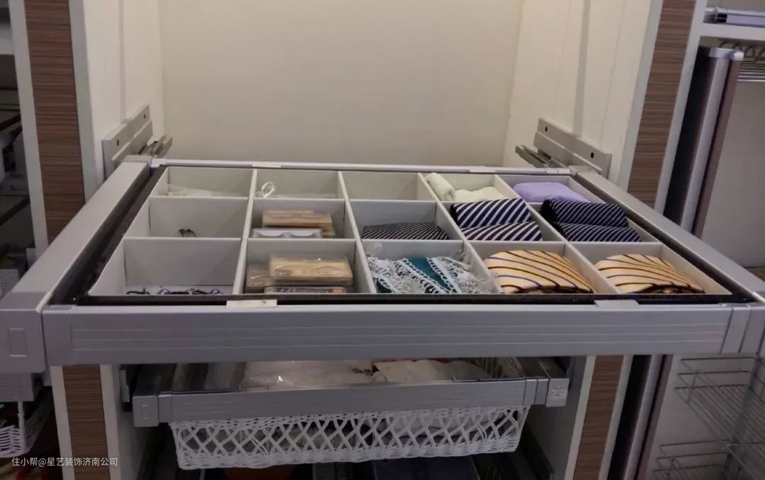 四边拉篮:为了提高衣帽间的容积,在有限的空间存放更多的物品,可以选择带滑轨的四边拉篮,适合存放纯毛料等不易折皱的衣服,不容易发霉、虫蛀。