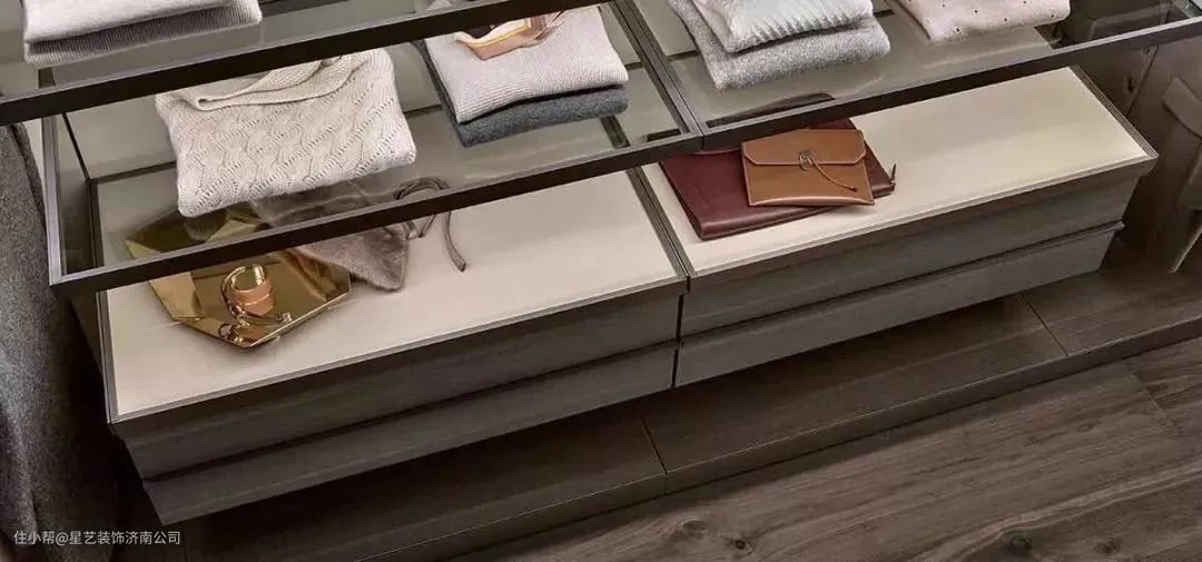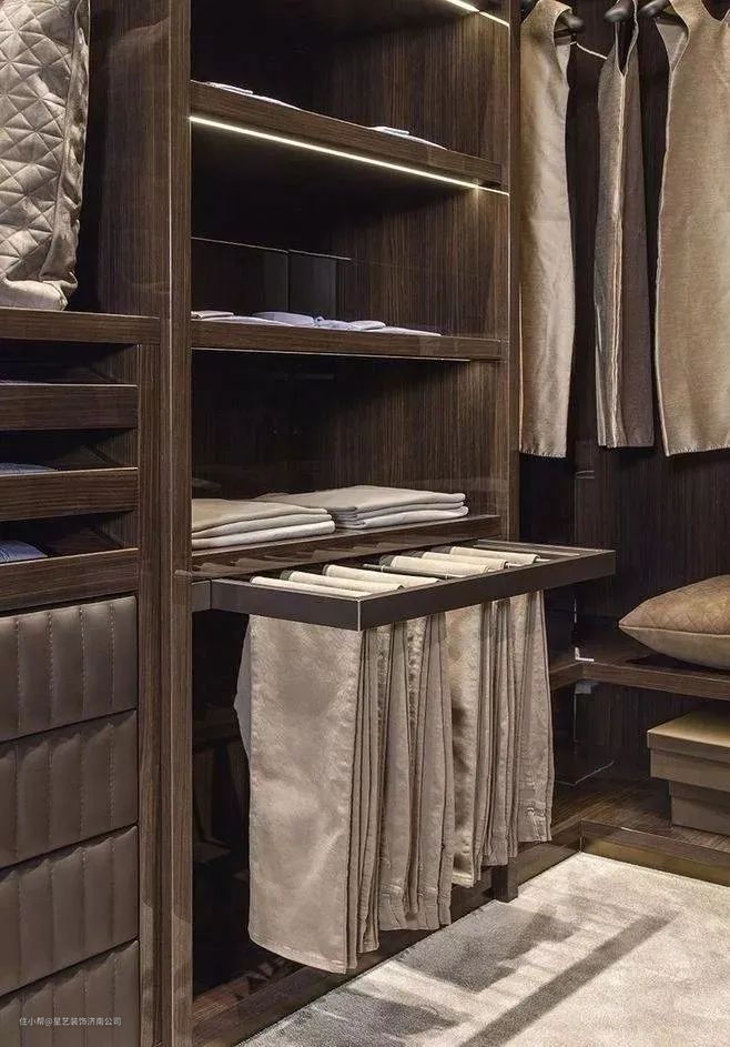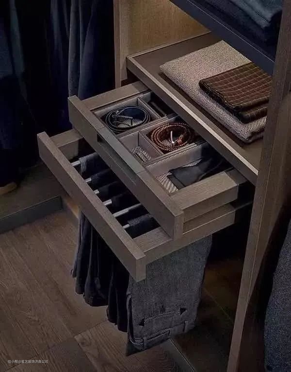 挂杆:带滑轨的金属挂杆是衣帽间的一大特色,阻尼静音设计的滑轨,抽拉更加顺滑,还不会划伤衣物,很适合挂放高级丝巾、领带、围巾、披肩等配饰。