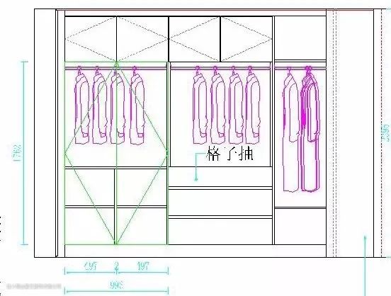 挂衣杆高度尺寸分别为1700mm、1300mm、900mm,分别用来挂长大衣、短上衣和长裤;挂衣杆与上面面板之间的间距在40-60mm之间。