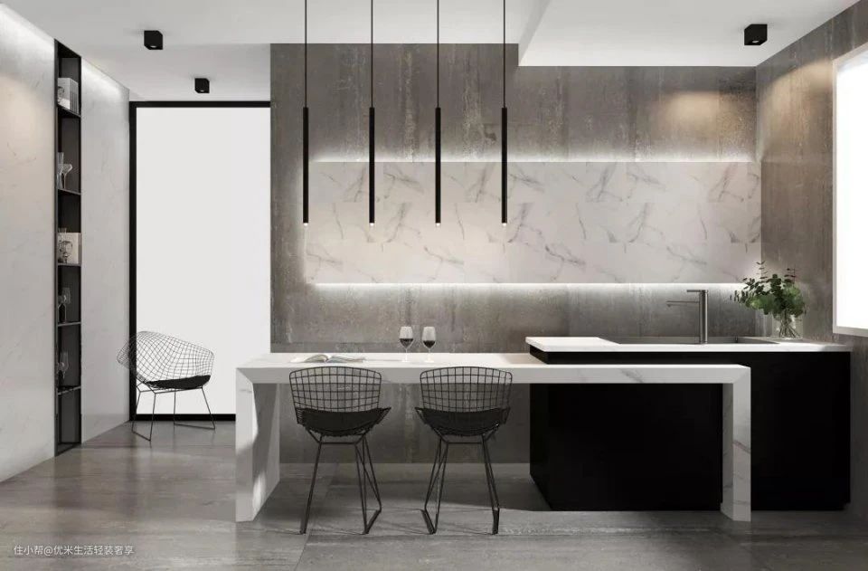 岩板尺寸可以做到3米多,能够大面积使用在装饰造型中,拼接缝隙少纹理自然流畅,让整个空间整体性更强,颜值超高。