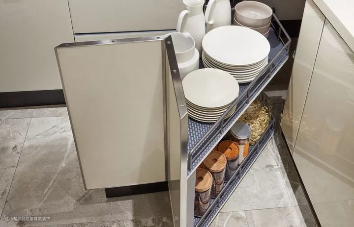 厨房收纳考验着你的居家能力,每一寸空间都足以瞥见你的智慧。如果厨房空间不大,将转角位置设计成小推车形式,不仅可以提升空间利用率,还可灵活移动,想推哪里就推哪里,清洁也更便捷彻底。