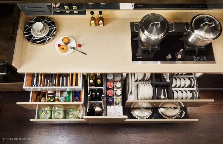 如果厨房台面太乱,东西到处放,会影响下厨的效率,这时候抽屉就该上场了,将台面的物品放进抽屉中,整洁有序,取用方便,也能给人带来好心情。