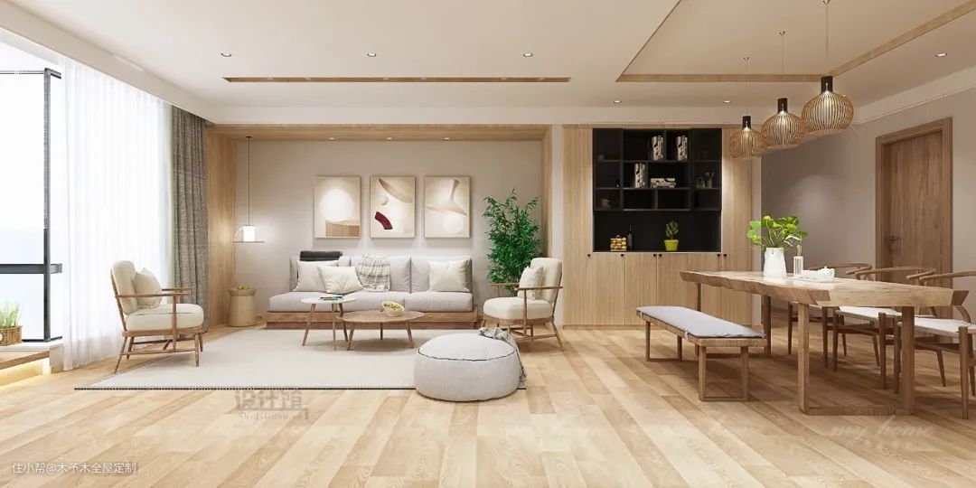 客厅与餐厅的吊顶做成一体的设计,整体吊平的天花,在客厅与餐厅区域分别加入木色装饰线条作为点缀,同时还能划分空间层次。