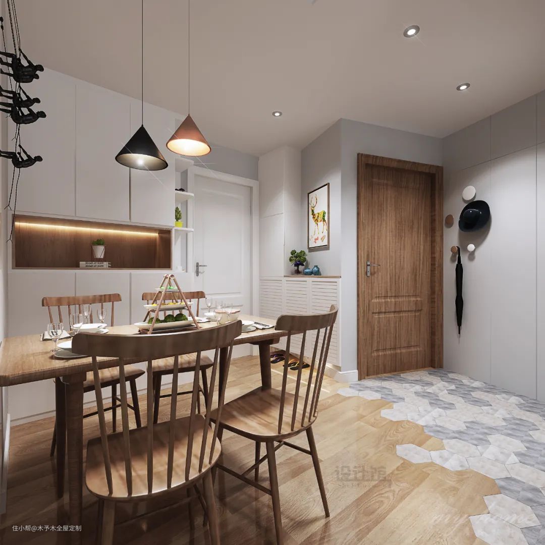 从天花上划分后,到了墙面部分,客厅与餐厅也可以做不同的选择,增加空间的分区利用效果。