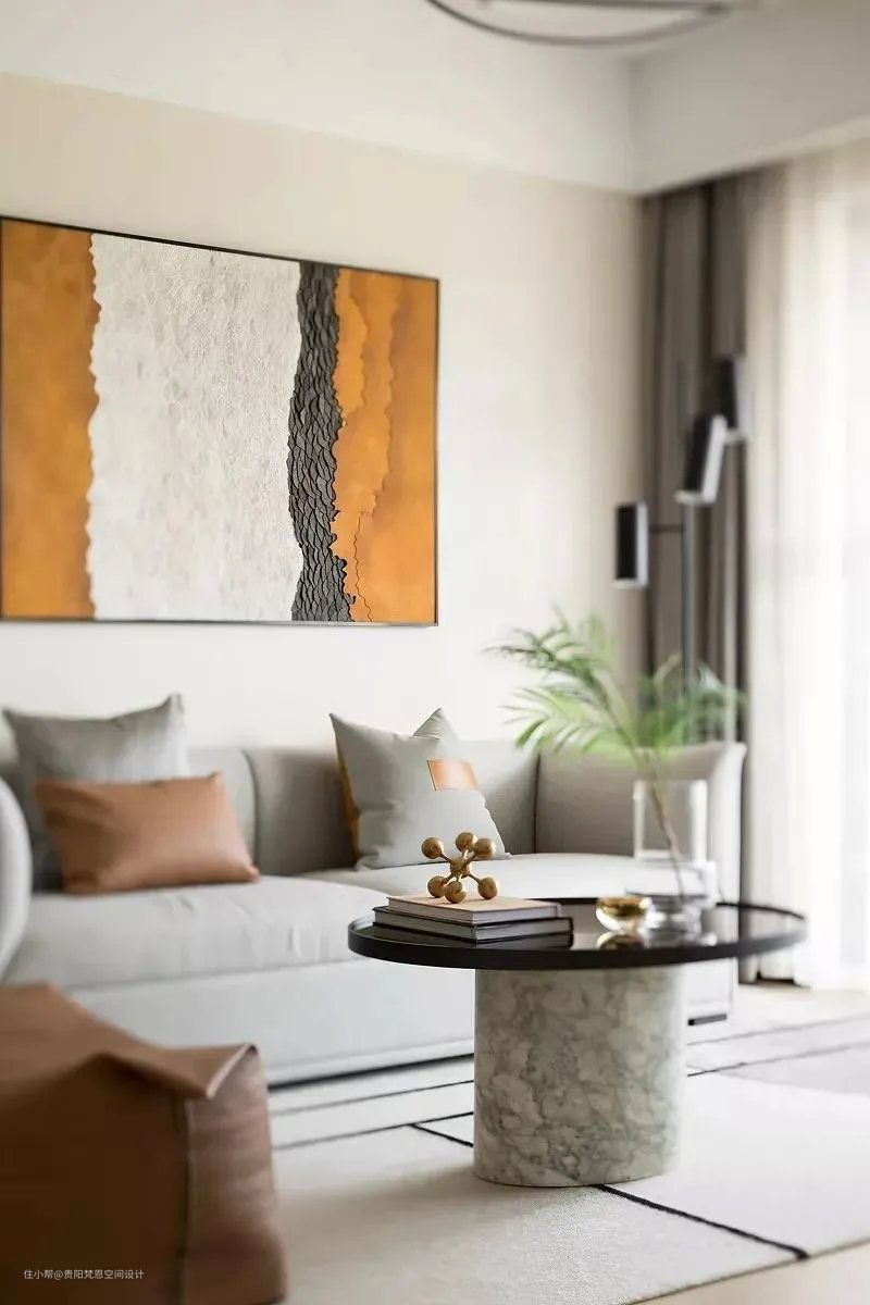 客厅以浅淡的肤色墙面,沙发墙上挂着一幅抽象的色彩装饰画,结合布艺沙发,还有皮质的休闲沙发椅,圆形的托盘茶几,让空间显得浪漫舒适而又轻松。茶几上的杂志与摆饰品布置,还有花瓶插花布置,与沙发墙挂画的颜色相呼应,也增添了客厅空间的清新与华丽气息,玻璃及黄铜的材质也丰富了空间的特性。
