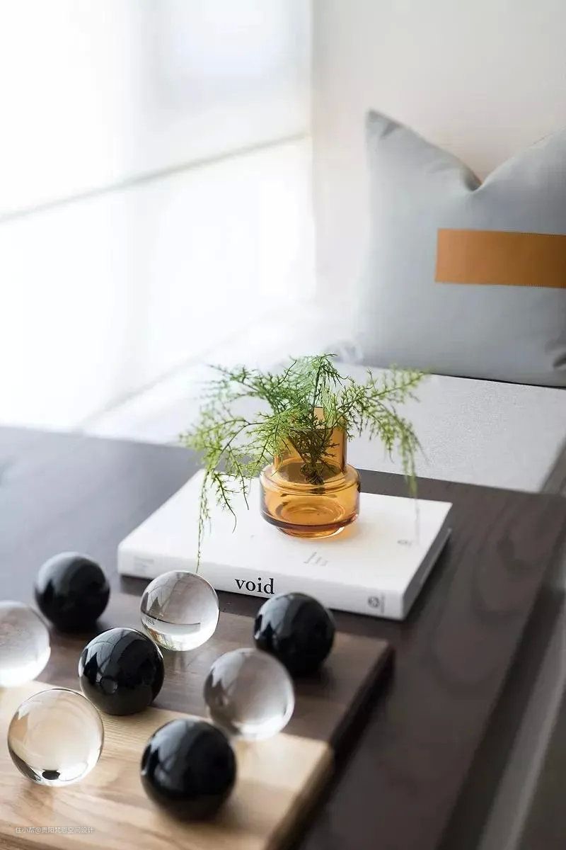 书房是用透明的玻璃隔断的但是视觉上还是并联在一起的,放了一个矮柜让空间显得不这么漂浮。因为是全透明的原因整体呈现出来的空间效果也是开阔又通透的,宽敞的视觉令人感觉舒心而又轻松。关上深色玻璃门,这里又变成一个独立的工作区,不受打扰。在家工作也有个舒服的位置。书桌后方的开放书架,摆上书籍与陶艺品,结合一张橙色的皮质办公椅,让书房显得简约而又活力时尚。书桌上的皮质小动物更是精致与时尚,引人入境。