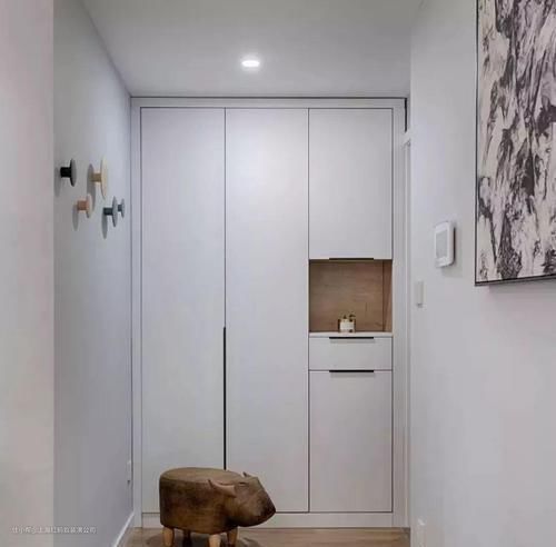 首先可以把玄关设计成,鞋柜+挂衣区式的小型衣帽间的形式,这样为入户收纳提供了更多可能性,不单可以用来收纳鞋子,一些常穿的衣物、包包等,进门也都可以直接挂在上面,方便便捷不少。这也是如今流行的一个趋势了,适合快节奏的生活,对吧。