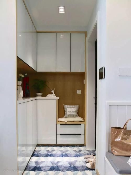 可别小看换鞋凳,没有它换鞋还真是不方便,尤其是家有老人、小孩的,最好设一个换鞋凳,进出入坐着换鞋,大大提升了生活的舒适感,而且占地也不大,一般空间允许,可与鞋柜连在一体,铺上垫子更完美了。如图上这款,把空间利用得足够充分了。