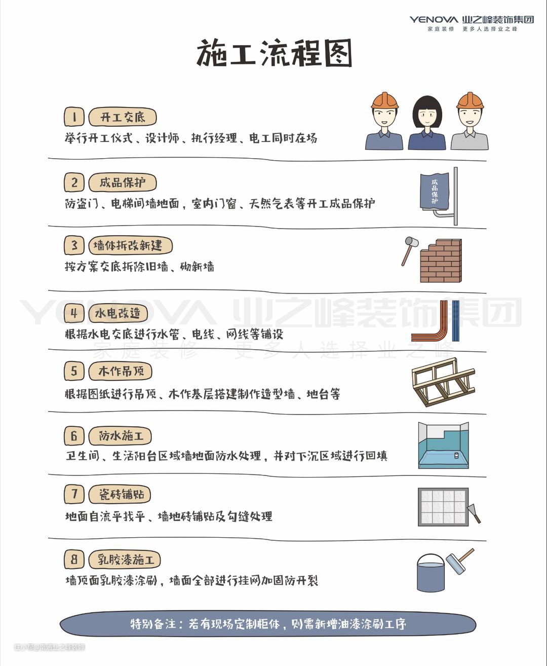 → 瓦工贴砖 → 木作施工 → 油漆施工 → 贴墙纸墙布 → 橱柜安装