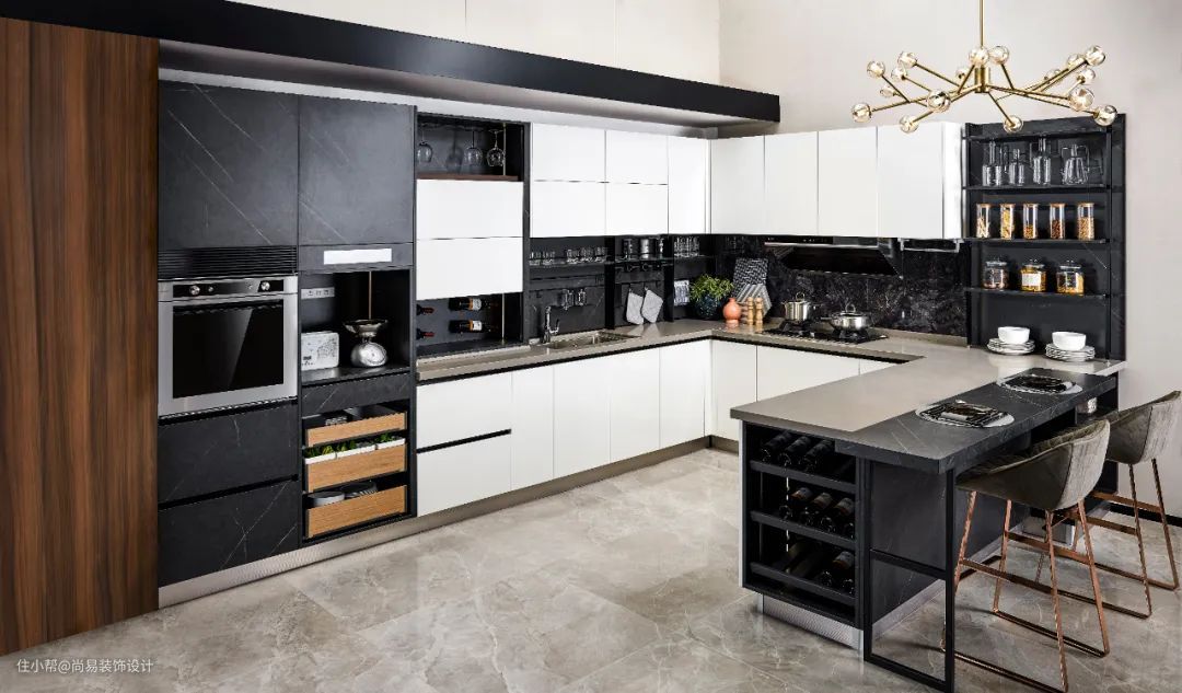 经典的黑白色调相碰撞,也会有意想不到的惊艳效果。例如幻影黑+经典白的组合,一深一浅两种颜色,让厨房的色彩层次更加丰富,空间更加灵活,达到和谐对比的效果,同时两色的搭配也让小空间有了一定的明亮和稳定。