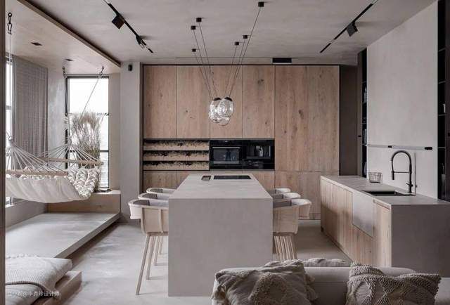 很多朋友选择一字型厨房,但是总觉得厨房台面不够用,那么我们也可以选择一字型厨房+岛台+餐桌的设计,岛台可以补充厨房台面,也可以完善餐厅收纳。