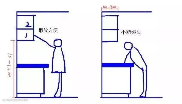吊柜过低会过深会碰到头,过高的话拿取物品不方便。
