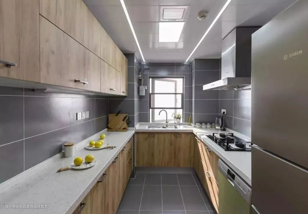 一字型厨房的动线比较长,做菜顺序一字排开:储藏区(冰箱)—水槽(洗菜)—加工区(切菜)—烹饪(灶台)—备餐区(装盘备用),这样的布局才能再大程度上减少走动,让做饭变得流程清晰、区域分明。