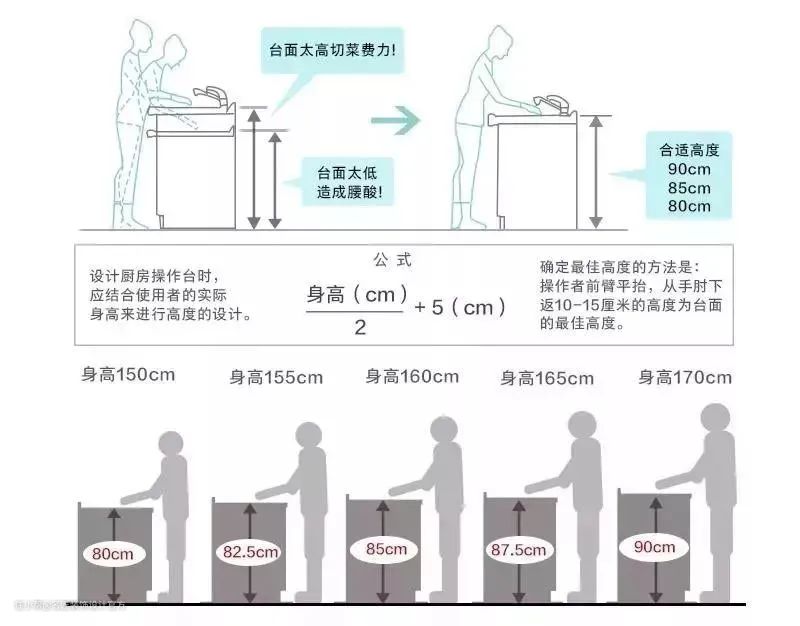 炒菜区台面高度=(身高÷2)+50mm如:身高170cm,