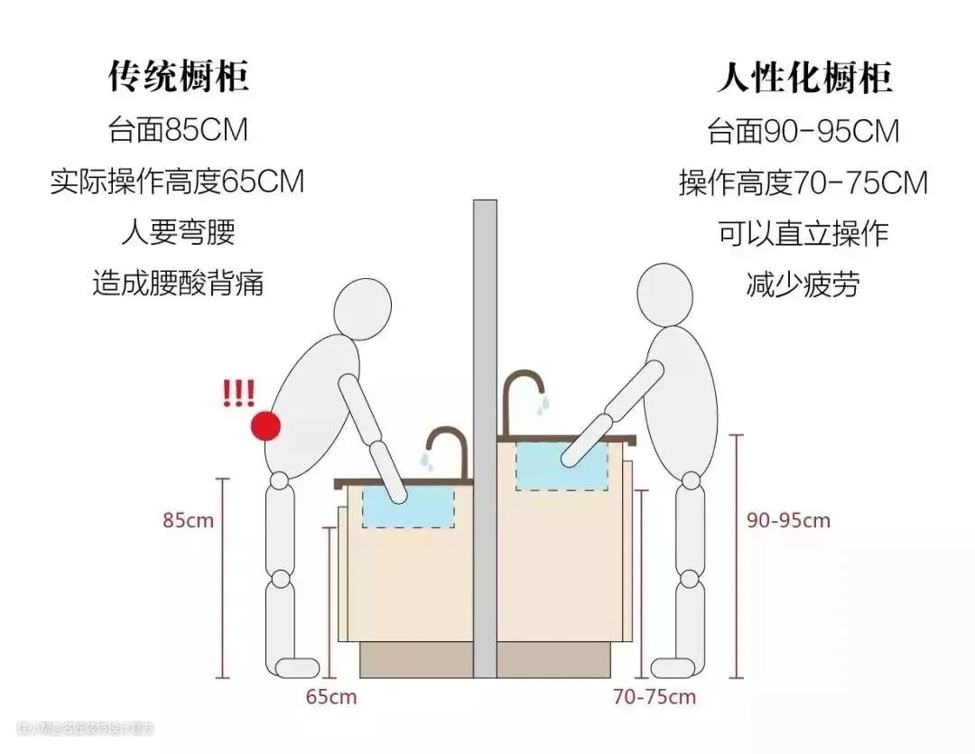 水槽台面与切菜台面通常要弯下腰,难免会感觉腰部酸痛,那如何计算适合自己的舒适高度呢?