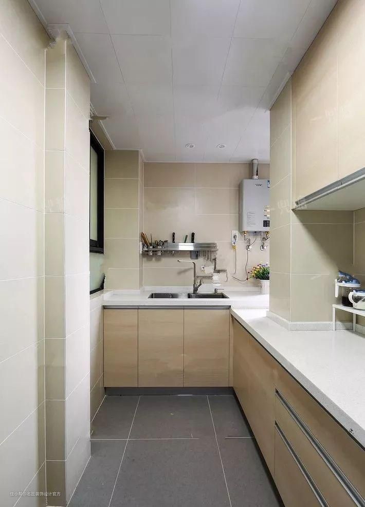 一字型厨房的动线比较长,做菜顺序一字排开:储藏区(冰箱)—水槽(洗菜)—加工区(切菜)—烹饪(灶台)—备餐区(装盘备用),这样的布局才能再大程度上减少走动,让做饭变得流程清晰、区域分明。