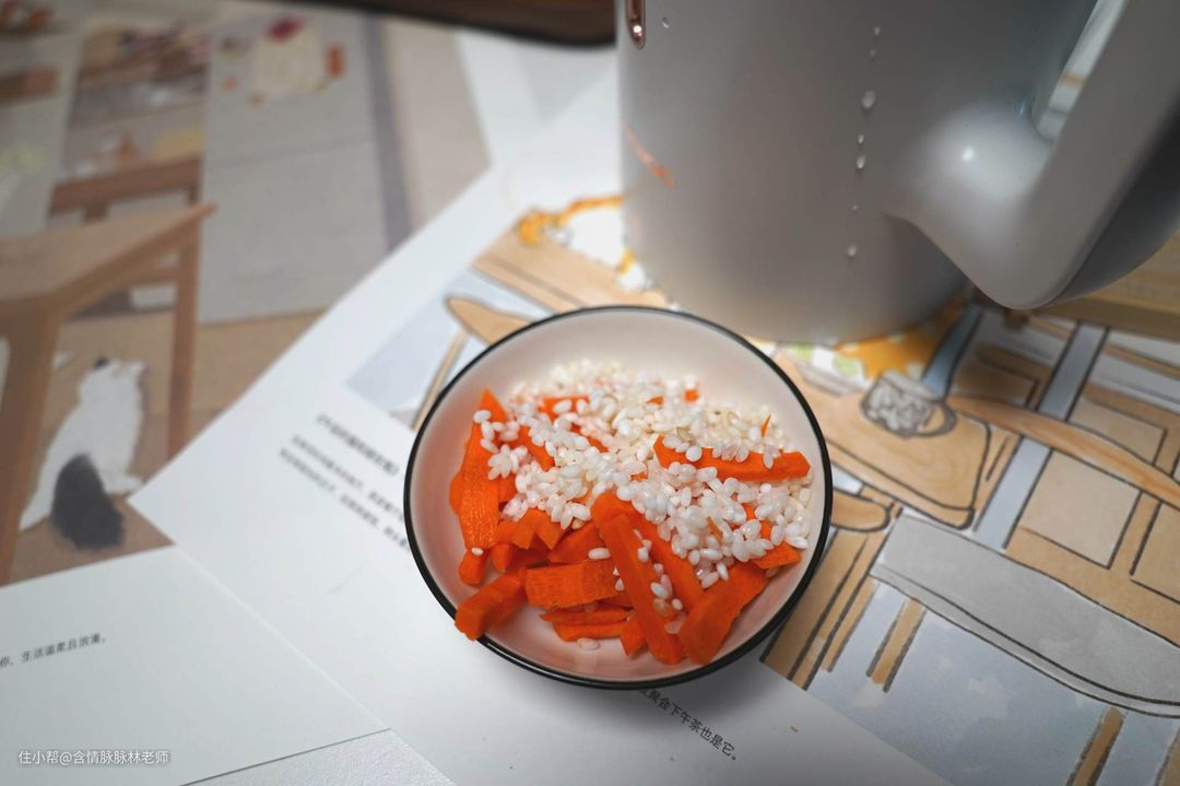 ▲胡萝卜米糊是这几款里面最好制作的一种,材料也比较简单,当然用户也可以根据自己的心得自己发挥。我品尝下来味道的确不错,没有生胡萝卜的味道,入口比较不错。