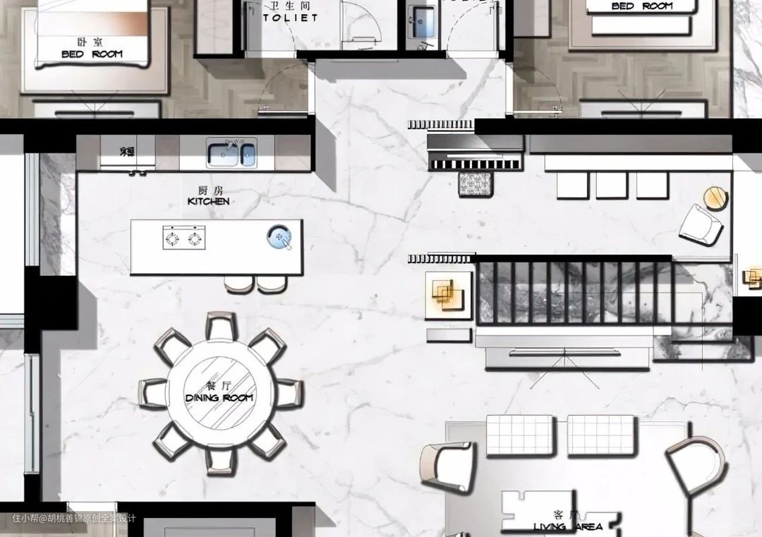 区域丰富的空间一般会考虑给厨房加岛式平台,对于社会厨房来说,在岛上的柜台上放一个吧台凳子准备饭菜。同时,你可以和你的家人和朋友聊天。迁移线的布局设计使空间人员流动更加顺畅方便。