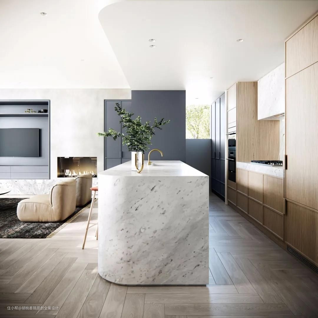 当然,还有其他一些方法。营造厨房与周围空间之间柔软边界的视觉感,它可以作为转换使用,也可以满足存储功能,提高空间利用效率节约空间。