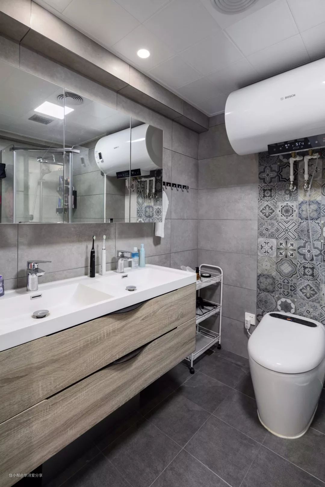 卫生间内部的空间是比较宽敞的,在转角的地方做了钻石型的淋浴房。浴室柜处做了双台盆的设计,让日常使用变得更加方便。