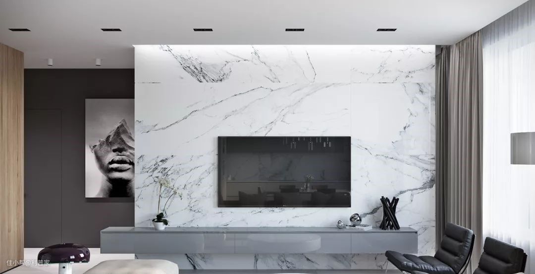 墙面没有造型,可以通过一些具有肌理感的材质,结合色彩的节奏来调和空间的层次。
