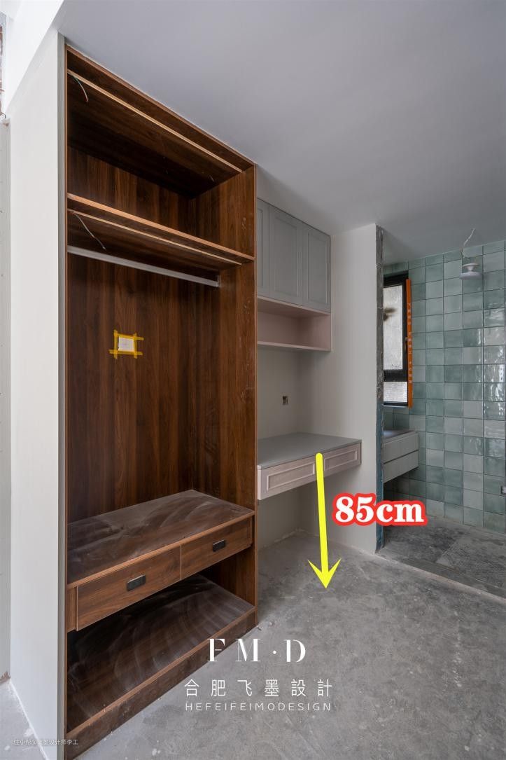 一侧的衣柜留出一半加上梳妆台设计,悬空85cm,方便清扫之外,后期摆上靠椅,当坐下来的时候,底下有足够的空间活动腿脚~台面上方还有吊柜和置物架,收纳梳妆用品也有地方了。