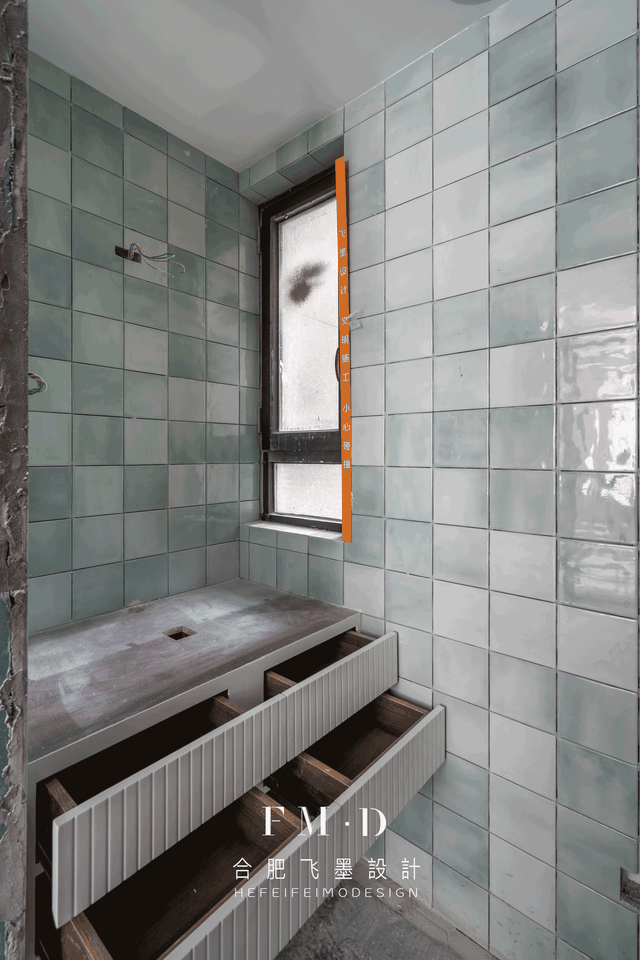 其中大套间最里面是卫生间,靠窗的位置,打造了洗漱台,底下悬空75cm高,方便清洁。卧室外面还有卫生间的话,那么两个人就能同时洗漱了,非常方便。洗漱台对面是如厕区,因为是硬装阶段,还没完工。