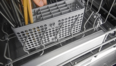 ▲在洗碗机内部有上下两个碗篮,均为可拆卸设计,更方便我们将餐具放入洗碗机。这里有一点需要注意,洗碗机的上碗篮与中喷臂设计在一起,因此如果在装回上碗篮的时候,没有推到底,则上喷臂就不会正常工作,从而导致洗碗机效果大打折扣。
