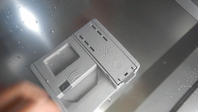 ▲打开洗碗机门,可以在活动门侧看到放置洗碗粉和亮碟剂的方格。