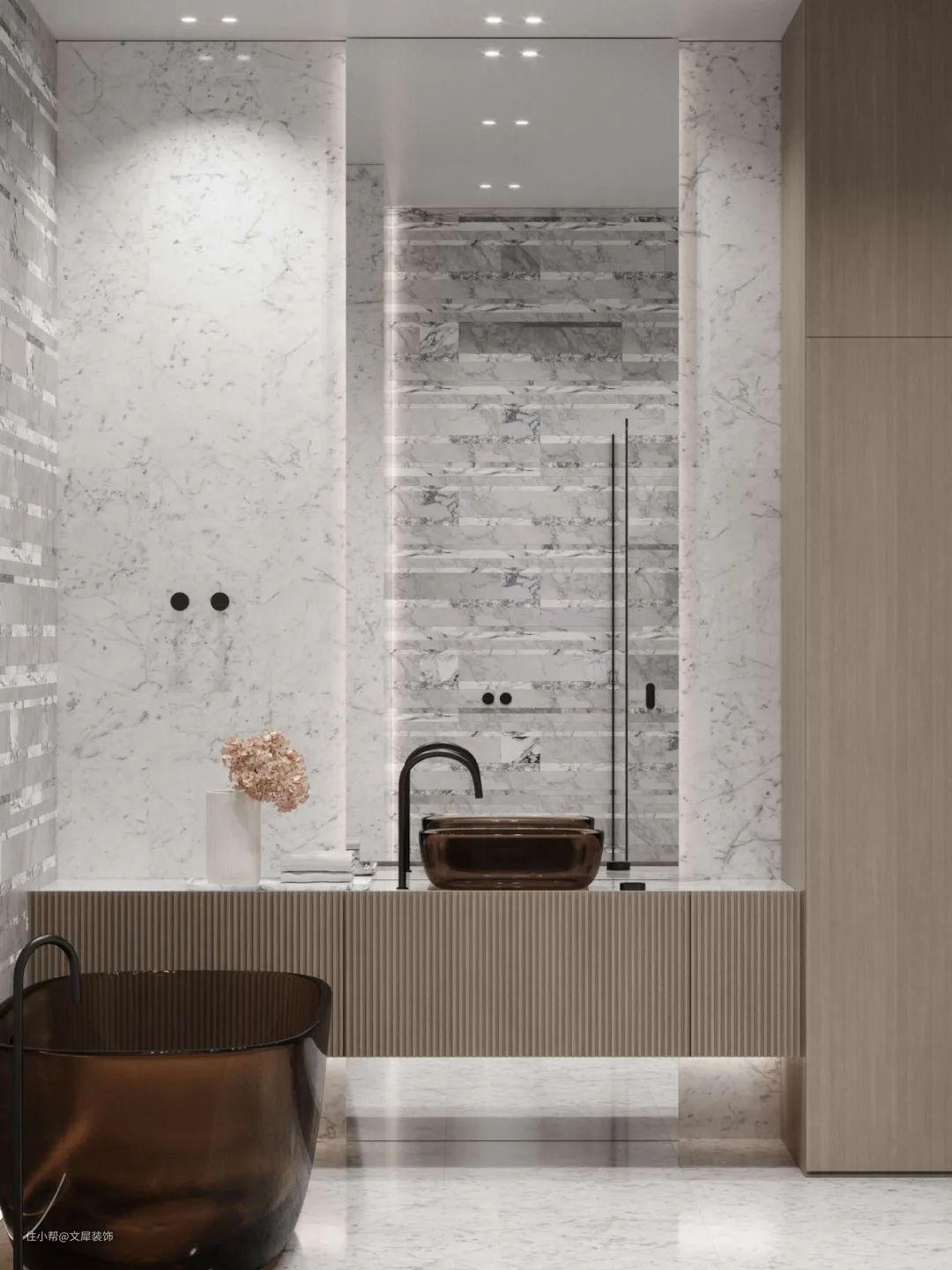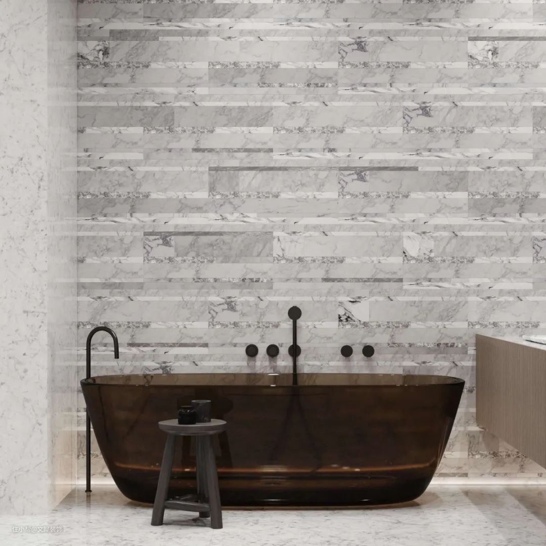 卫生间采用大理石、木材和亚克力的材质,低饱和度色调诠释简约中的精致细腻。