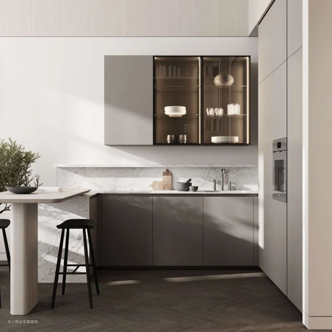 全开放式的餐厨区是现代家居常见的布局方式之一,大理石台面与木质桌面色调一致,简约而精美。