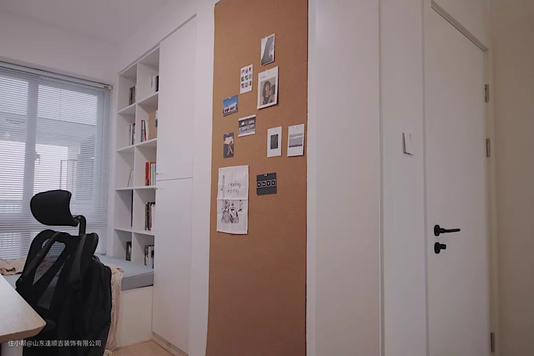 书桌后天的墙面以软木板+图钉挂上装饰画,搭配一旁的书架,显得实用文艺且优雅。