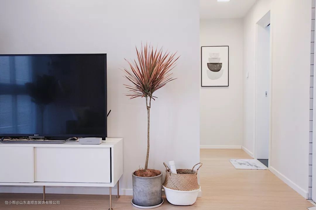 电视墙保持原有的的白墙,简约清爽,电视柜旁也摆放了一盆比较有特色的绿植,显得文艺又精致。