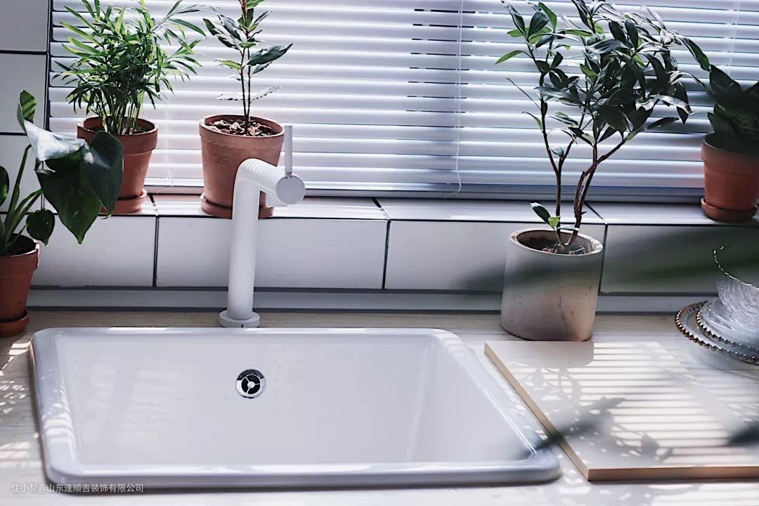 厨房水槽的设计也很有北欧风的感觉,不同于普遍的不锈钢,改成了白色的,白天的时候阳光还可以透过百叶窗投射进来,显得清新惬意。
