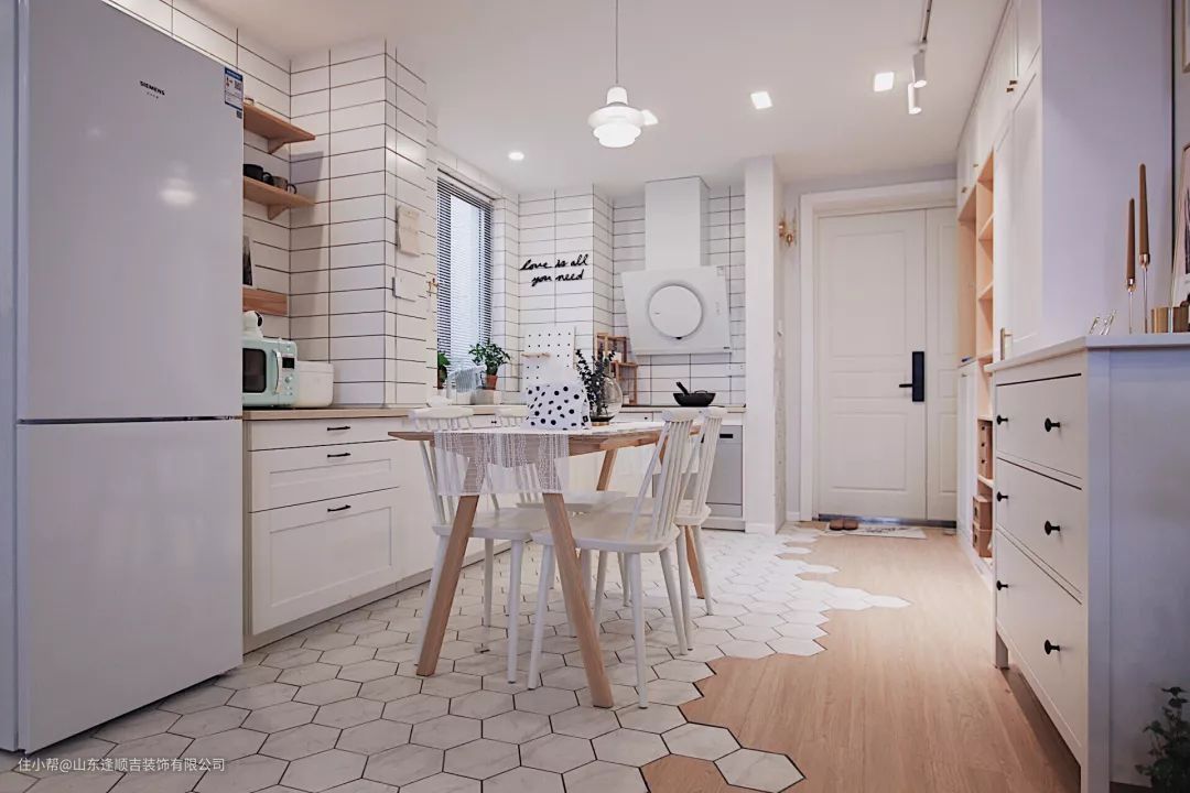 餐厅厨房和客厅都是开放式的设计,厨餐厅和客厅采用六边形地砖区分开。