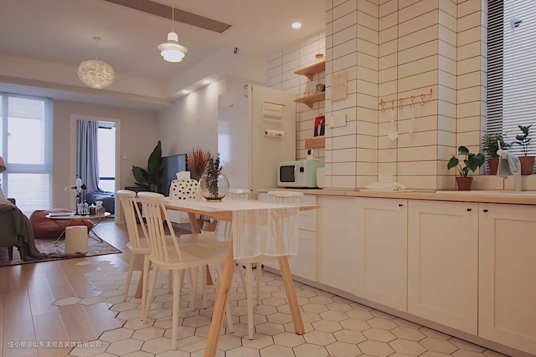 厨房空间围绕着餐厅布置成L形的格局,小白砖墙面,更增加了空间的文艺舒适感。进门左侧是玄关柜,实用又美观。