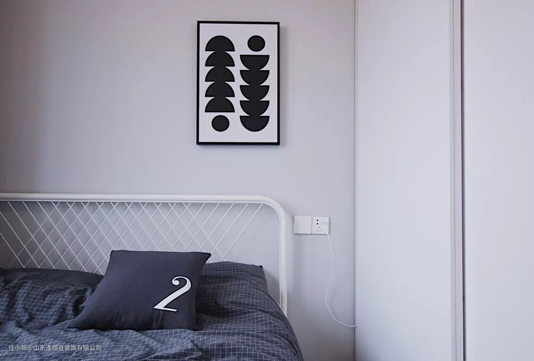 小小的儿童房以浅灰色空间,简约灰色的空间搭配白色铁艺床、黑白挂画,还有灰色床单,简洁时尚又大气。