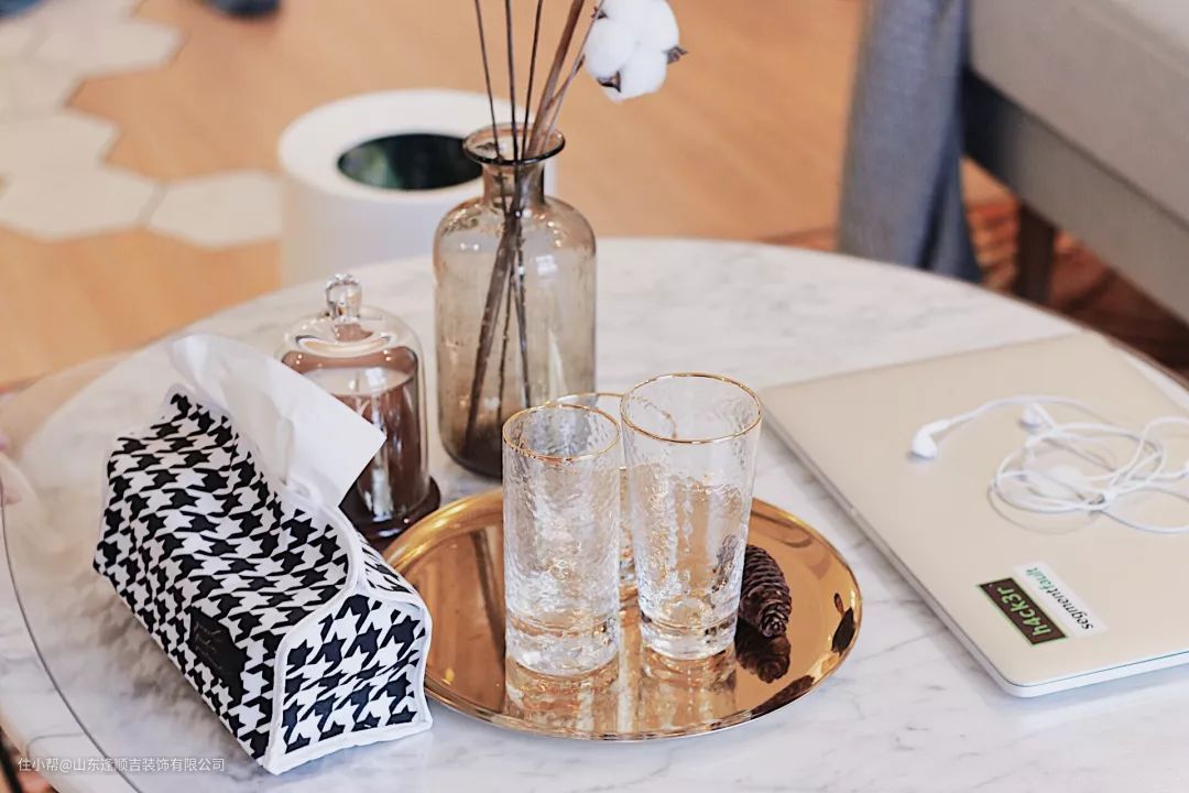 圆形大理石茶几上布置上精致的香薰与装饰,也是显得格外端庄雅致。