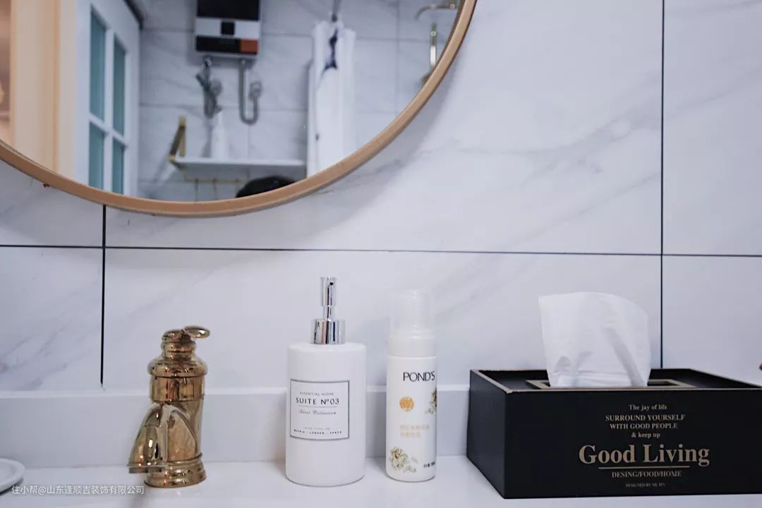 洗手盆台面上的卫浴用品,错落有致的放置,也是精致优雅好大气。