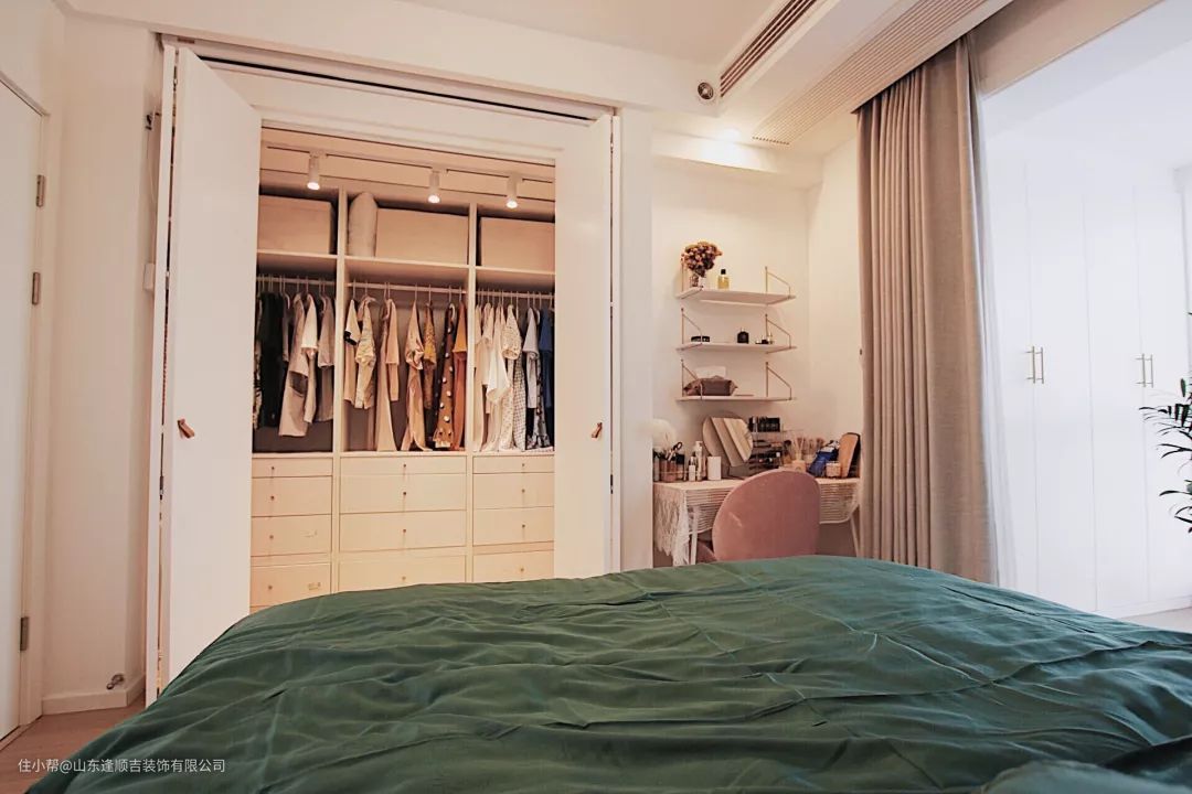 床尾腾出空间做成所有女人都梦寐以求的衣帽间,满足了业主衣物收纳的需求。衣帽间右侧还腾出了一个梳妆台的位置,满足梳妆的需求。