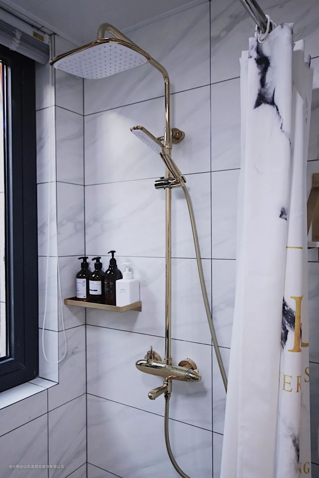 淋浴区以浴帘隔断,铜色的花洒与搁架,轻奢而又气质。